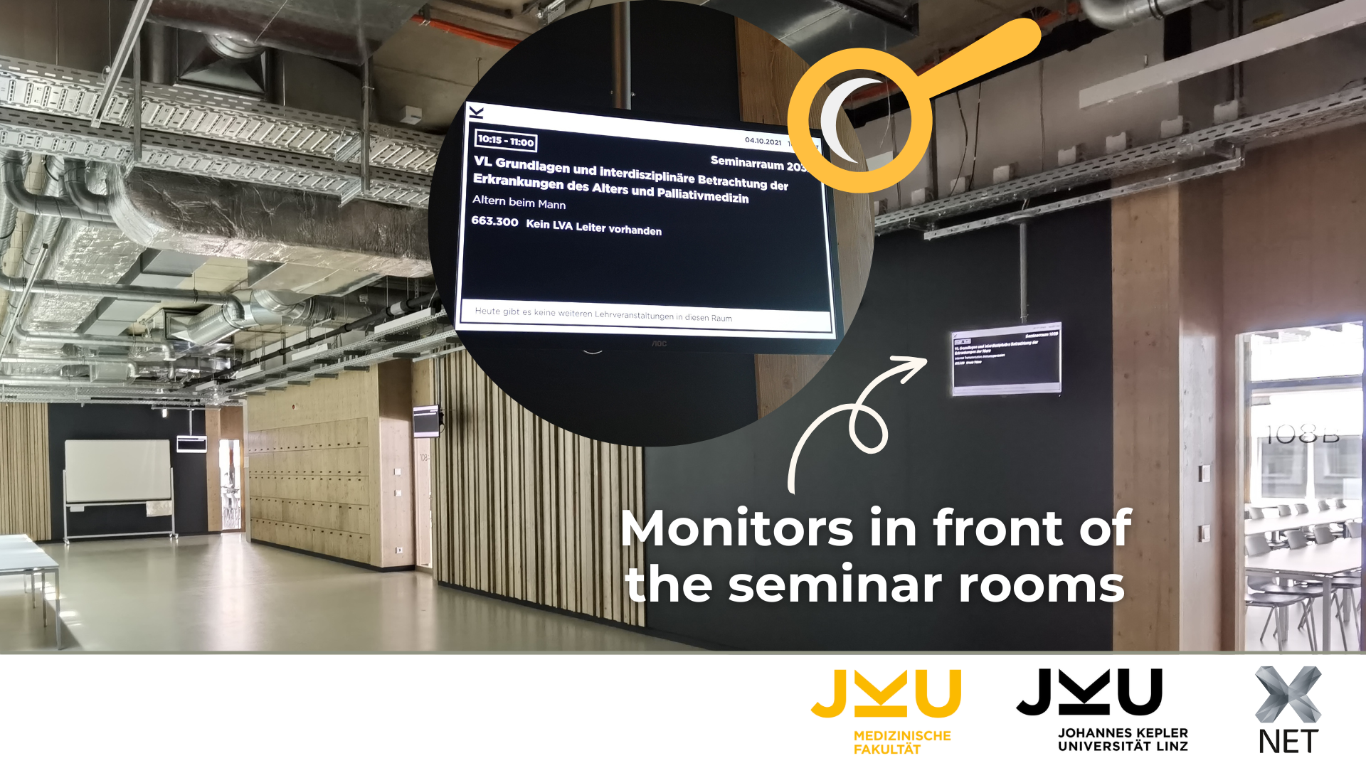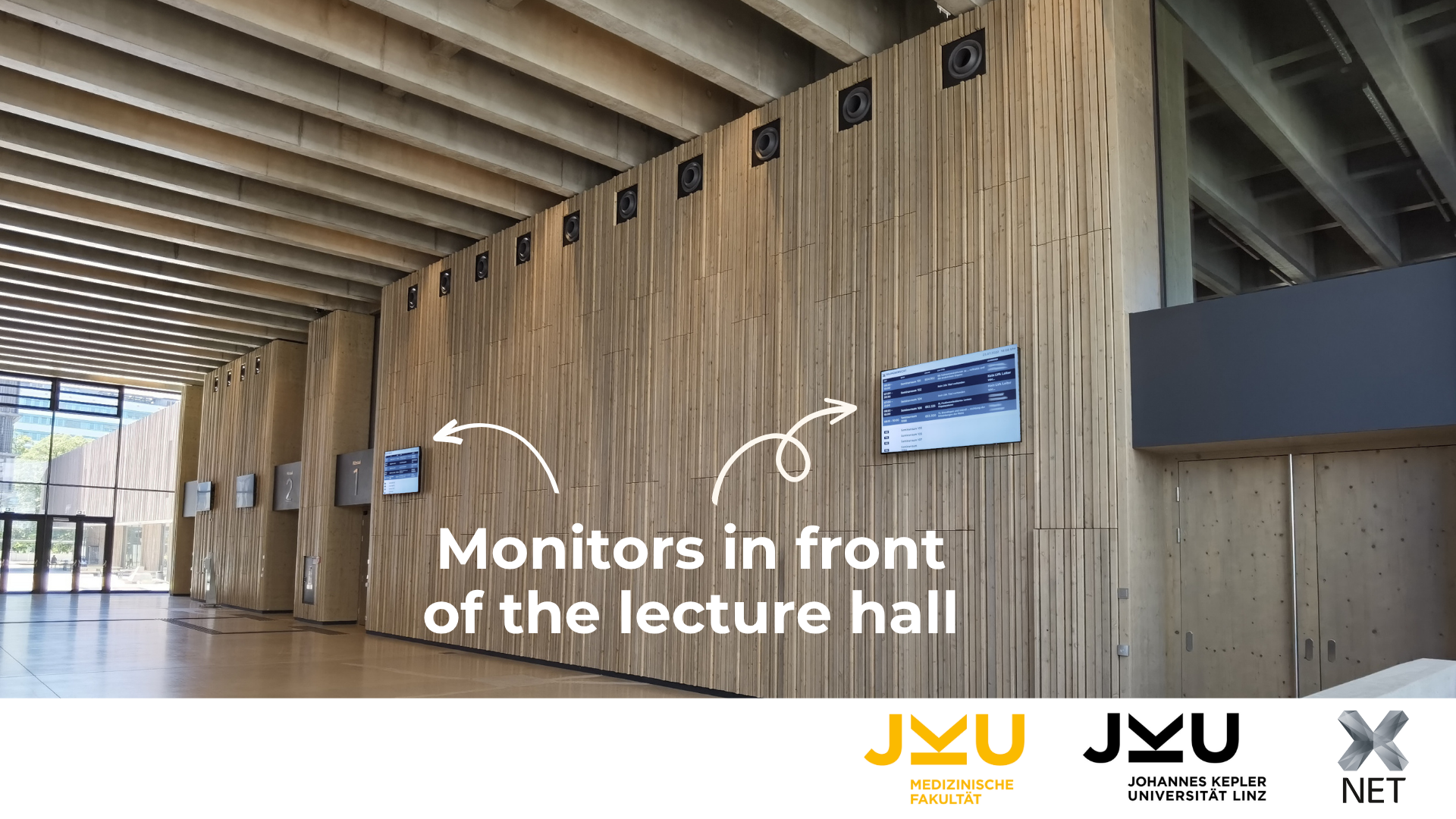 The overall CARDEA system comprises indoor units in the rooms of the Medical Faculty in Med Campus I, as well as outdoor monitors for displaying courses and orientation monitors for an overview of courses and events on a particular floor. 1,800 students can now be scheduled easily.